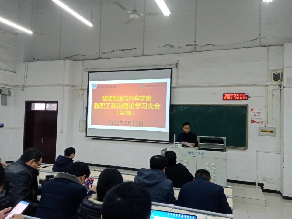 根据学校《关于做好2022年2月教职工政治理论学习安排的通知》,2022年2月17日上午,智能制造与汽车学院全体教职员工在北校区9-212教室集中开展了2月份教职工政治理论学习。