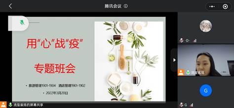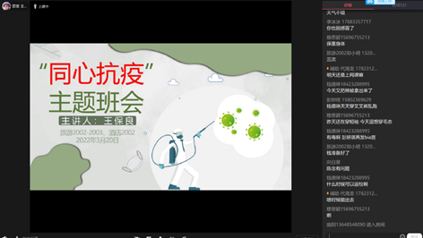 首先,辅导员、班主任老师倡议全体同学“不懈怠、不恐慌、不抱怨、不添乱”,提醒同学们戴口罩、勤洗手,注意自己的健康码是否有变化,如有异常,及时上报。随后强调几个方面的问题。一是强调每日健康打卡的重要性,要求同学们严格执行各项管理规定,每天定时测体温、按时完成早中晚三次健康打卡;二是强调在特殊时期同学们要规范自己的言行,文明上网,不信谣、不传谣,不网购;三是在疫情防控的同时要注意自己的身心健康,调整好自己的情绪,减少焦虑;四是多多理解包容他人,在关键时刻要有担当,积极主动承担责任,不怕苦不怕累;五是任何时候都要学会感恩,用实际行动配合学校打赢这场疫情防控战、阻击战。最后,叮嘱同学们遇到事情及时联系老师,师生同心,共同战“疫”,守护安全。