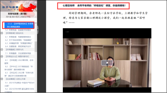 所有关于重电抗疫的叙事与记忆,都是由一个个普通学生的生活和记忆构成。虽然重电学子不是每个人都奋战在抗疫一线,但每个人又都必须在另一个隐形战场上顽强斗争,这就是心理战场。面对疫情,不少学生的心理有了些许微妙的变化,容易产生情绪问题,引发心理危机。形策教研室的教师们秉持全过程育人的理念,全时段和学生保持沟通,为其解惑,引导学生在疫情常态化防控环境下健康积极地生活和学习。同时,借助教学团队专业多样化的特点,发挥双师型教师团队特色,让具有心理咨询师资格的教师开设心理调适线上课堂,如余秀平老师的“呼吸放松”课堂,引导学生课后自我心理调适,有效促进学生认知合理、情绪稳定、行为适当、人际和谐、适应变化。