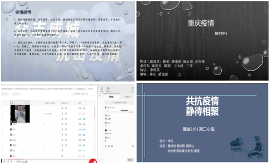 师生积极互动,教学效果突出。学生也是此次疫情防控的参与者,授课教师在课堂教学中与学生积极互动,在线上教学有限的教学环境条件下,通过各种教学形式组织学生积极主动参与课堂,从学生的视角来谈对此次疫情防控的认识和对抗疫精神的理解。各班参与了学校志愿服务的同学,如通运2101班的胡俊、移动通信2101班的郑星雨、智能互联2103班的阮鑫等同学,讲述了自己参与学校几次核酸检测的志愿服务经历和感悟,在同学中反响热烈,积极在线连麦谈感悟;智能互联2104班学生付世龙在课堂上为班上同学直播自己参与校友捐赠物资的搬运工作,学生纷纷为校友的热心捐赠和同学的志愿服务精神而感动;学生还通过课堂展示、小组讨论等方式分享体会,如智能互联2104班学生徐菲燕在分享中谈到了自己被每天吃住在学校随时关心着学生的辅导员老师、认真线上教学的任课老师、提供各种物资保障的学校各部门而感动,感受到了在疫情中重电对学生的关怀,要对学校表达深深的感谢。还有学生谈到以前是通过新闻报道了解,这次是亲身感受到了重电速度、中国速度,了解了国家在疫情防控中采取的各项有力措施,是国家带给了自己安全感,为身为中国人而感到骄傲和自豪。