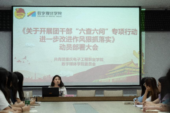 为深入学习贯彻习近平总书记对团干部提出的系列重要要求,认真落实共青团中央《新时代全面从严治团实施纲要》《关于提高政治站位改进工作作风的六条规定》精神,根据校团委印发《关于开展团干部“六查六问”专项行动进一步改进作风狠抓落实的实施方案》的通知,数字媒体学院团总支于2022年4月25日下午顺利开展团干部“六查六问”专项行动、进一步改进作风狠抓落实动员部署会。学院各级学生团干参与本次动员部署会,本次大会由数字媒体学院团总支书记吴艾佳主持。
