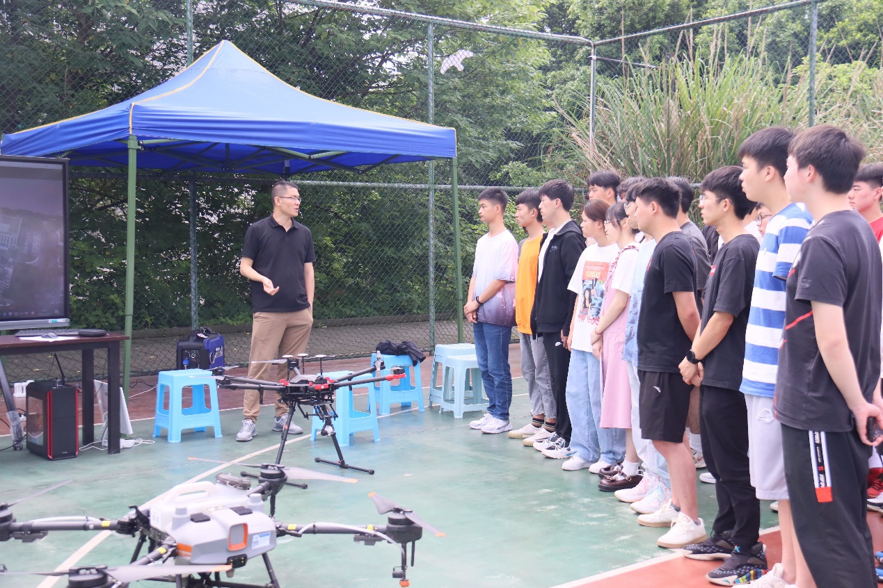 陈世江老师向同学们展示了植保无人机的主要结构,介绍了依托植保无人机开展飞防作业、种子播种等方面生产的意义,并着重强调了无人机植保对于缓解农村劳动力短缺,促进农业机械化发展方面的重要作用,现场进行了植保无人机播撒农药演示。
