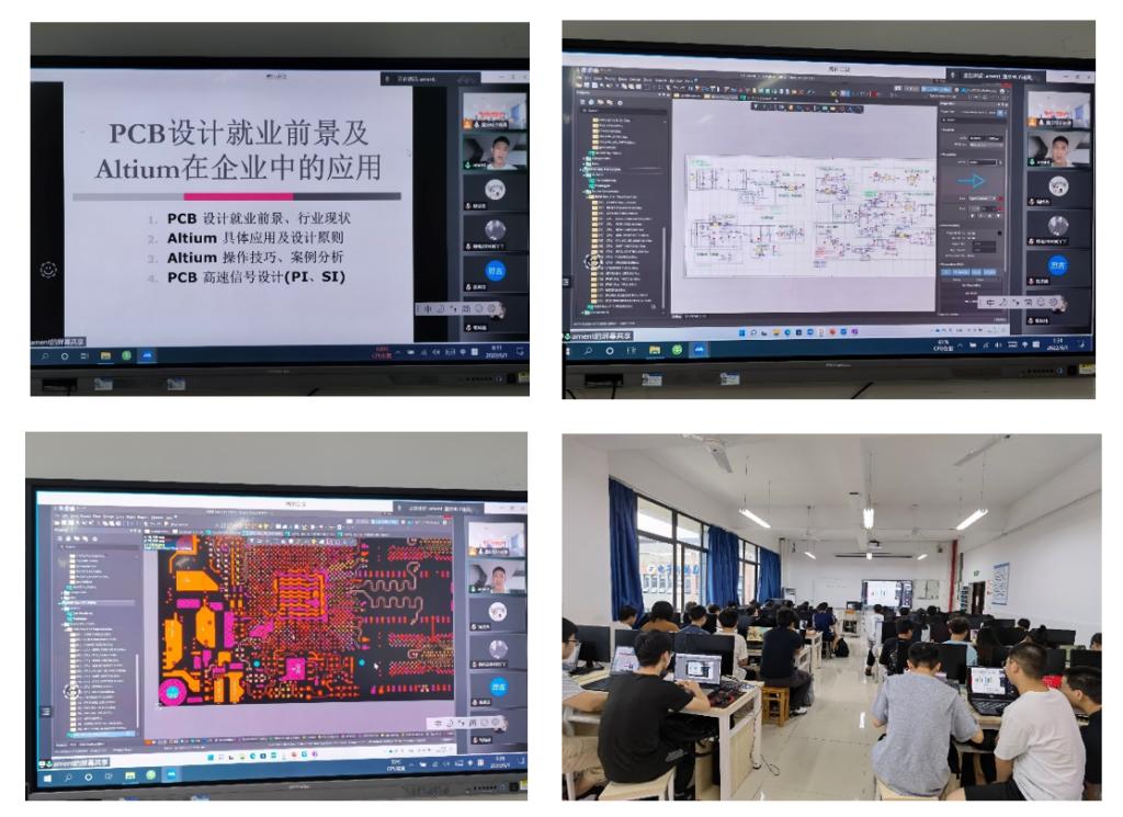 张汝纹工程师曾参与多项重大项目的鉴定试验,在硬件电路设计、电磁兼容EMI和EMS测试,环境试验、产品耐辐照老化试验等方面具有极为丰富的经验。授课前会同课程组林涛博士、卢静博士、周莹副教授等多位集成电路专业群教师针对学生情况、教学资源等进行了深入研讨。教学中从电子线路板设计的就业前景、行业现状以及薪酬待遇等方面与学生展开倾心交流,并介绍了PCB岗位职责和任职要求,然后通过高速信号电路板、CPU控制板等复杂电路板设计案例全方位展示了电气隔离、安全规范要求、EMC设计等方面的技术技能要求。最后,张汝纹工程师以A/D芯片限购为例鼓励大家常怀产业报国之志。