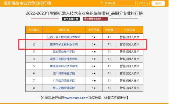 专业代码:460304,专业名称:智能机器人技术,获2022-2023年“金平果”高职院校专业排行榜5★水平等级。