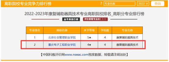专业代码:520602,专业名称:康复辅助器具技术,获2022-2023年“金平果”高职院校专业排行榜4★水平等级。
