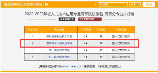 专业代码:510210,专业名称:嵌入式技术应用,获2022-2023年“金平果”高职院校专业排行榜4★水平等级。