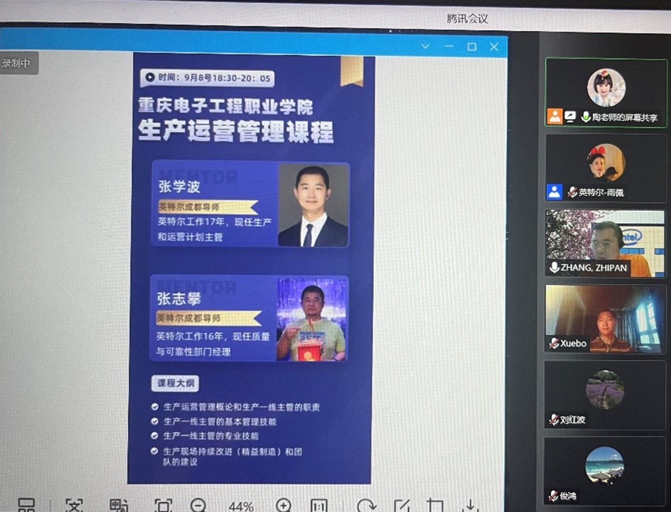 9月8日是电子物联网学院21级电信2104班《数字产业化企业管理实务》的授课时间,我院将英特尔产品(成都)有限公司的企业导师们请进了专业课堂。他们分别是英特尔成都质量与可靠性部门经理张志攀、生产与运营计划主管张学波。经过前期沟通交流和集体备课,本课堂创新主要表现为以下两方面: