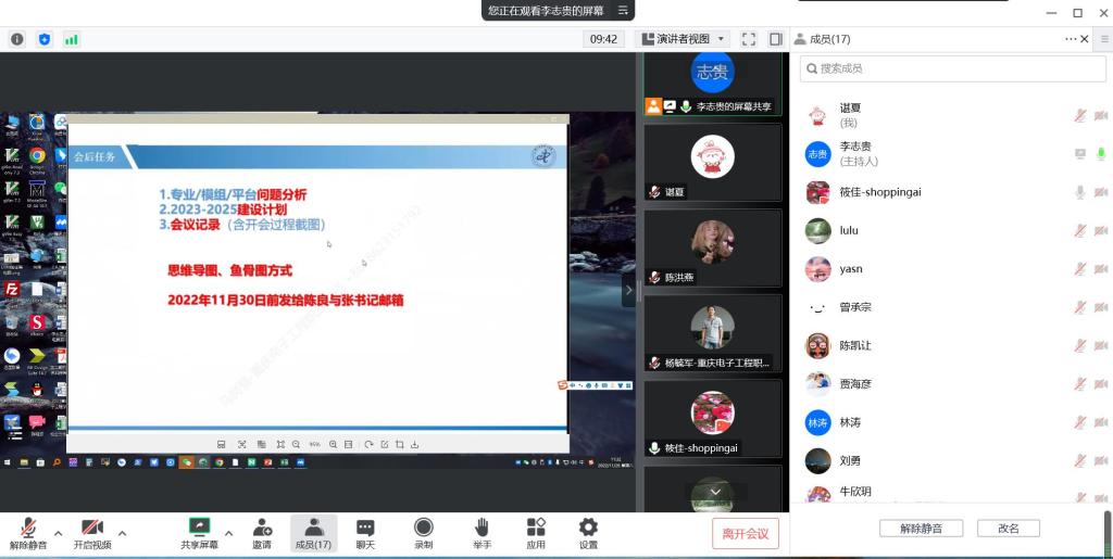 11月26日,为进一步加强专业与模组内涵建设,找准定位,着眼未来,提升星空(中国)质量,促进专业建设高质量发展,电子与物联网学院微电子技术与集成电路技术专业在线召开了专业与模组建设研讨会,就专业和模组中存在的问题进行梳理与分析,对未来专业与模组的建设规划开展深入研讨交流。集成电路系主任马岗强与微电子技术、集成电路技术专业全体教师参加了研讨会,会议由微电子技术专业主任李志贵主持。