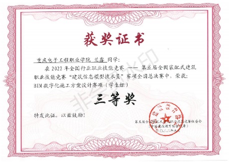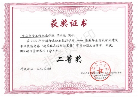 住房和城乡建设部人事司为指导单位,中国就业培训技术指导中心为主办单位的2022年全国行业职业技能竞赛—第五届全国装配式建筑职业技能竞赛“建筑信息模型技术员”赛项全国总决赛(以下简称“全国总决赛”)将于2022年9月23-25日在浙江省杭州市,重庆电子工程职业学院共4名同学参加,其中周琪竣获得赛项三项目管理模块二等奖、兰鑫和陈建伟同学获得BIM数字化施工方案设计赛项(学生组)三等奖。