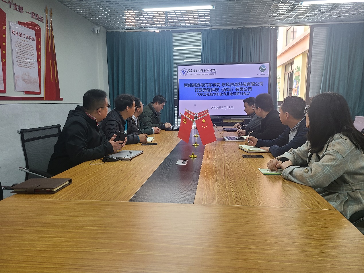 3月15日上午,智能制造与汽车学院召开了汽车工程技术专业建设产教融合研讨会。东风悦享科技有限公司校企合作负责人徐晖、行云新能科技(深圳)有限公司区域经理崔广兴、智能制造与汽车学院副院长王勇以及汽车工程系教师代表参加了研讨会。