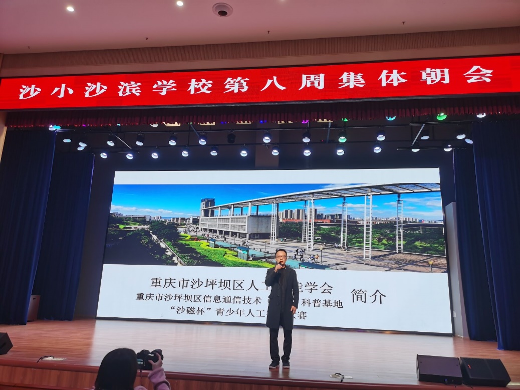 李饶老师首先公布了沙滨学校在第三届“沙磁杯”青少年人工智能大赛中的获奖情况,随后介绍了沙坪坝区人工智能学会的基本情况,主要职能,科普工作开展情况,科普基地建设情况等,并详细的介绍了“沙磁杯”青少年人工智能大赛的开展情况,主要领域,奖项设置等,同时介绍了第四届“沙磁杯”青少年人工智能大赛的筹备情况,时间安排。最后,就如何做好青少年科普教育工作与沙滨学校相关老师做了进一步沟通。