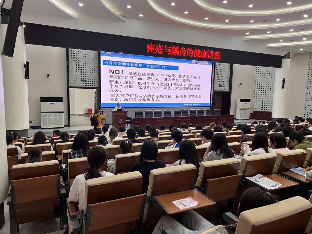痤疮是常见的皮肤病,也叫青春痘,它在青少年中高发,但它并不是青春期的专利产品,新生儿、成人也会长痤疮。本次讲座讲述了痤疮形成的原因和治疗,图文并茂,并通过有奖提问的方式让学生们积极参与,现场气氛活跃,让学生们对痤疮有了更深刻的了解,意识到发现痤疮等皮肤问题应当到正规医疗机构专科规范性诊治。