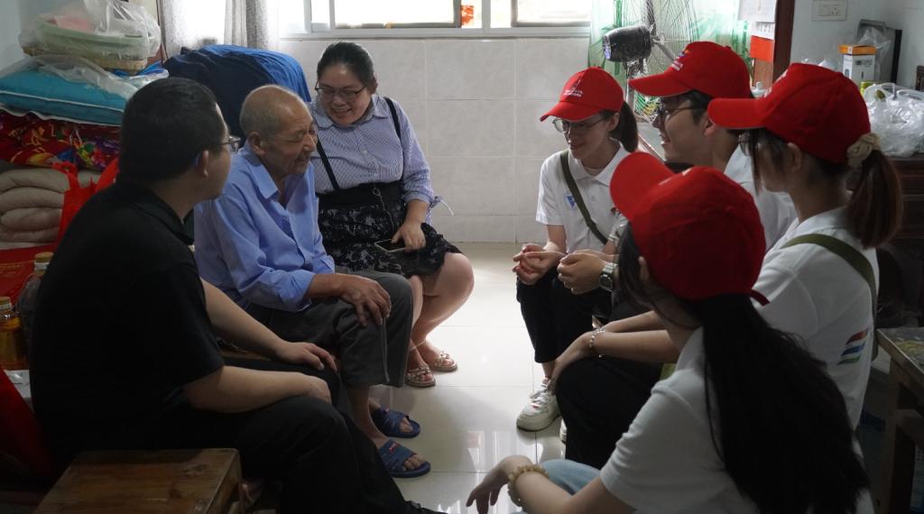 图注:实践团成员围坐在陈有涛老党员身边,聆听陈老的党员故事