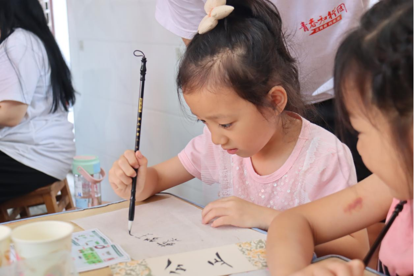 在中华传统文化课堂上,实践队员以彭水苗绣为切入点,将当地的少数民族非遗文化融入推普课堂,打造“推普+文化传承”模式,将推广普通话和中国优秀传统文化相结合,在推广普及国家通用语言文字的同时,让孩子们了解并传承中华优秀传统文化,铸牢中华民族共同体意识。实践队员们还设计了“剪纸”“猜灯谜”“毛笔书法”等中国传统文化项目,进一步规范汉字书写,加深孩子们对国家通用语言文字的认同感,增强文化自信,助力乡村文化振兴。